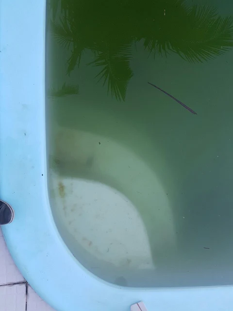 | É possível olhar alguns centímetros mais fundo na piscina, sinal de que as algas que obstruíam a visão foram dissolvidas, oxidadas ou vulgarmente "queimadas" |